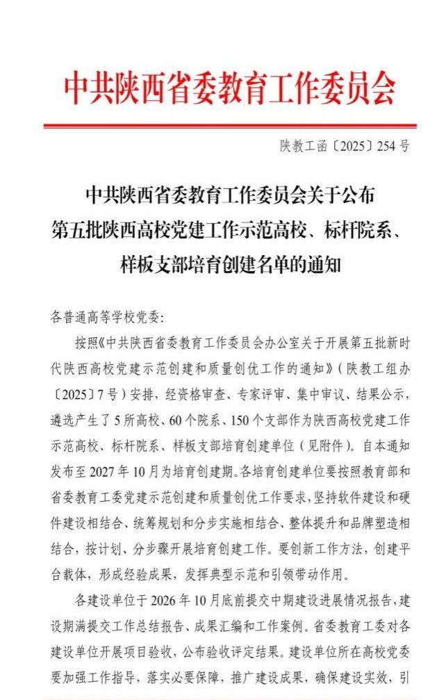 近日,中共陕西省委教育工作委员会发布《关于公布第五批陕西高校党建工作示范高校、标杆院系及样板支部培育创建单位名单的通知》,51动漫