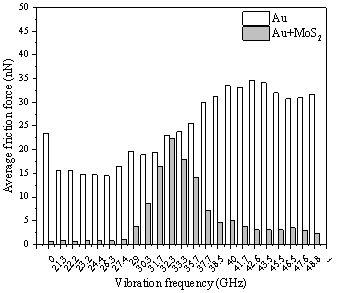 此外,该课题组建立了软金属与二硫化钼润滑组合分子动力学模型(图6),探究了颤振环境下金和二硫化钼协同润滑工况下的碰撞摩擦性能。结果表明:金膜较好的吸振性和导热性结合二硫化钼高的面内刚度和低的摩擦系数,使得金与二硫化钼协同润滑工况在一定的振动频率范围内表现出更优异的摩擦性能(图7),平均摩擦力最大可降低97.5%。与此同时,研究发现温度和褶皱现象是影响二硫化钼摩擦性能的重要因素,高温和褶皱现象都将导致二硫化钼摩擦性能急剧下降。