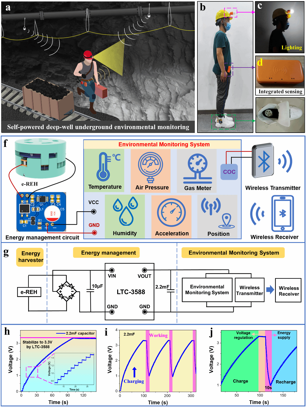 由于轻便、紧凑和高效的机械传动设计和多层相移设计,使得新型驻极体旋转发电机实现小型化并进一步集成到鞋中,能够很好的收集人体运动时足部产生的能量,进而用于可穿戴的能量收集和自供能的地下环境监测应用(图4所示)。这项研究在为传感器供电和建立自供电可穿戴传感器网络方面的实际应用具有巨大意义。
