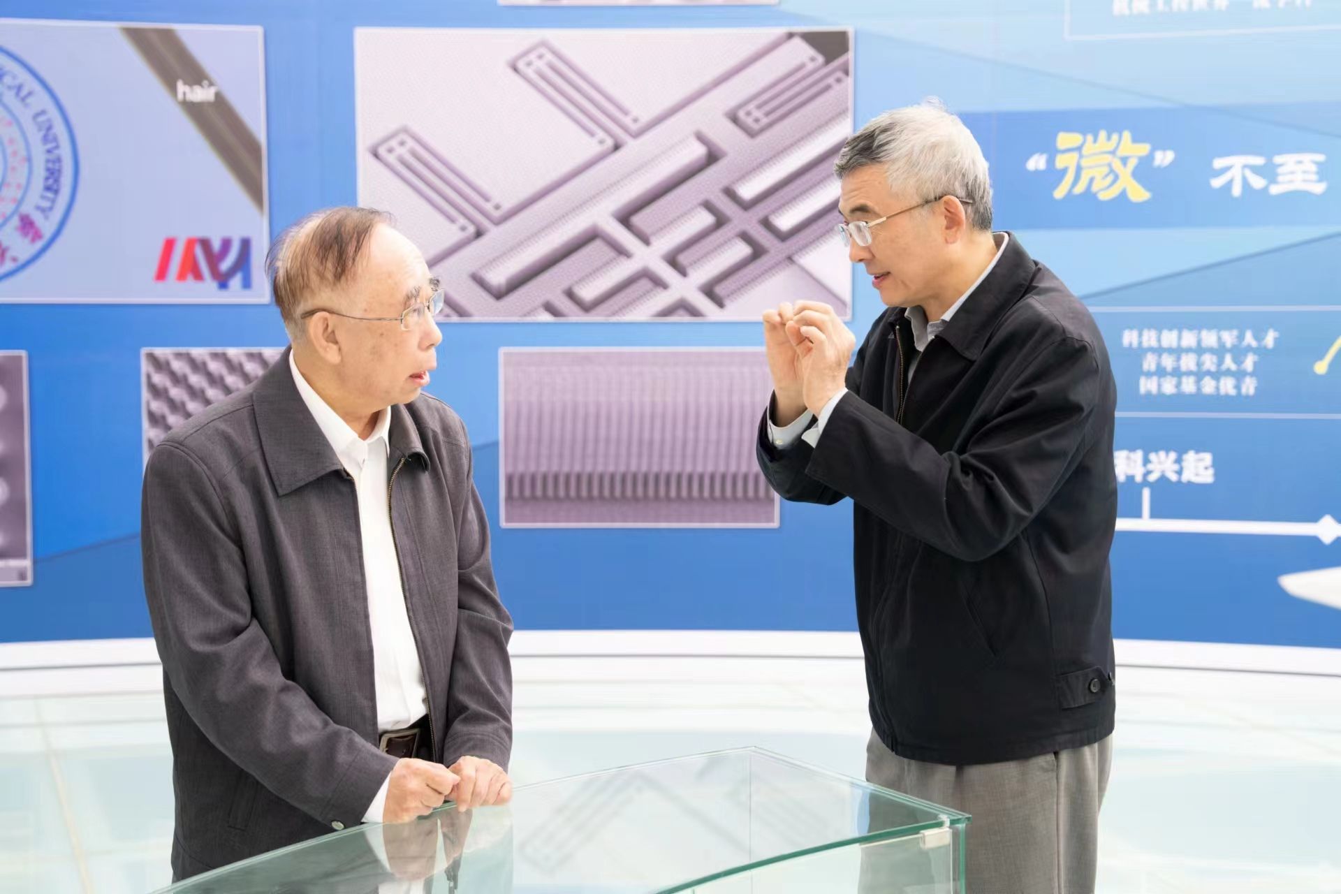 会前,冯培德院士在苑伟政教授陪同下参观了空天微纳系统教育部重点实验室。苑教授向冯院士介绍了实验室近年来取得的最新进展,展示了实验室研发的相关器件,冯院士对实验室近年来取得的成果表示了肯定。