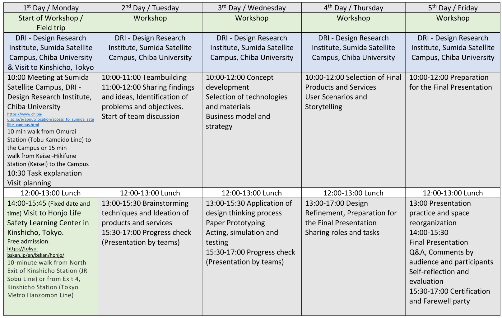 本次项目立足于“灾难防治管理设计”(Design for Disaster Preparedness)的主题,将使用以下四种方法来提出具体的设计建议:如何创建用户场景(User scenarios)、如何为灾害管理创造产品或服务的概念(created concepts of products or/and services for disaster preparedness)、可视化业务画布构建(Visual business canvas construction)、纸上原型方法(Paper prototyping method)。千叶大学将以上四种方法牢牢结合实际,同时让同学们有机会参与设计讨论和展示,旨在培养能够灵活顺应时代的需求,引领设计先驱的国际化人才。