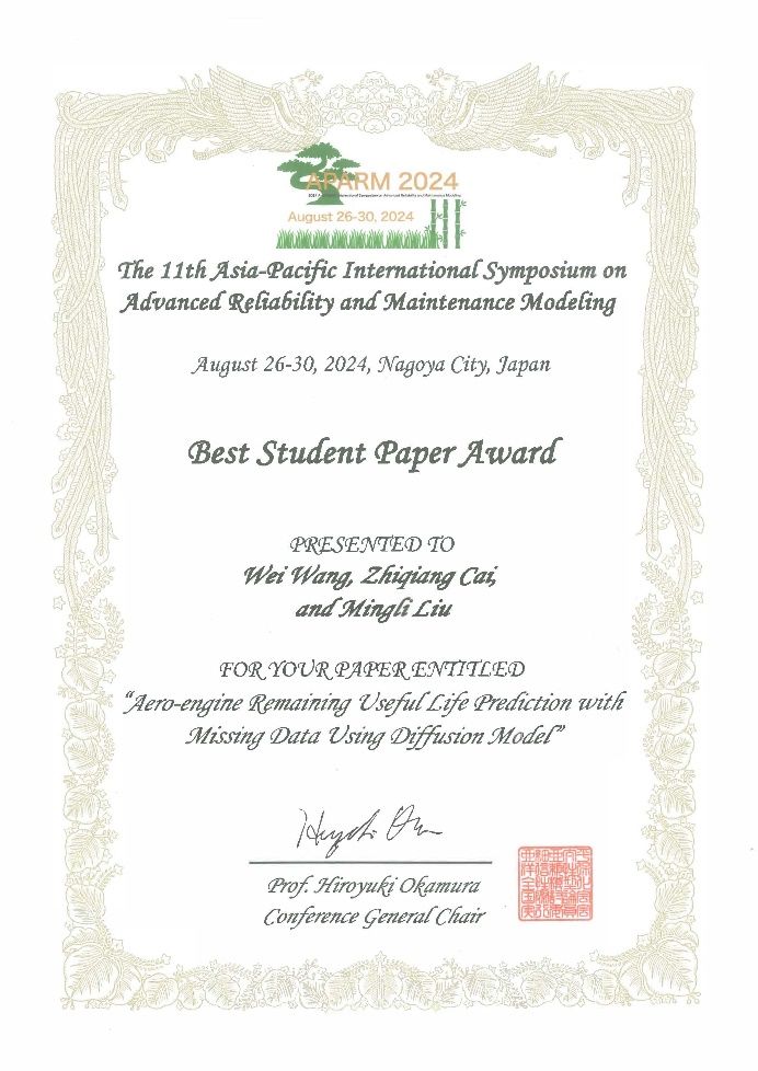 蔡志强教授课题组荣获了APARM 2024最佳学生论文奖。获奖论文题为《Aero-engine Remaining Useful Life Prediction with Missing Data Using Diffusion Model》。该论文聚焦于航空发动机状态监测数据缺失对深度学习模型预测精度的影响,提出了一种名为DiffFMD的创新数据填充方法。通过有效填补数据缺失,这一方法显著提升了剩余使用寿命预测的准确性,展现了该课题组在复杂系统可靠性研究方面的重要进展。
